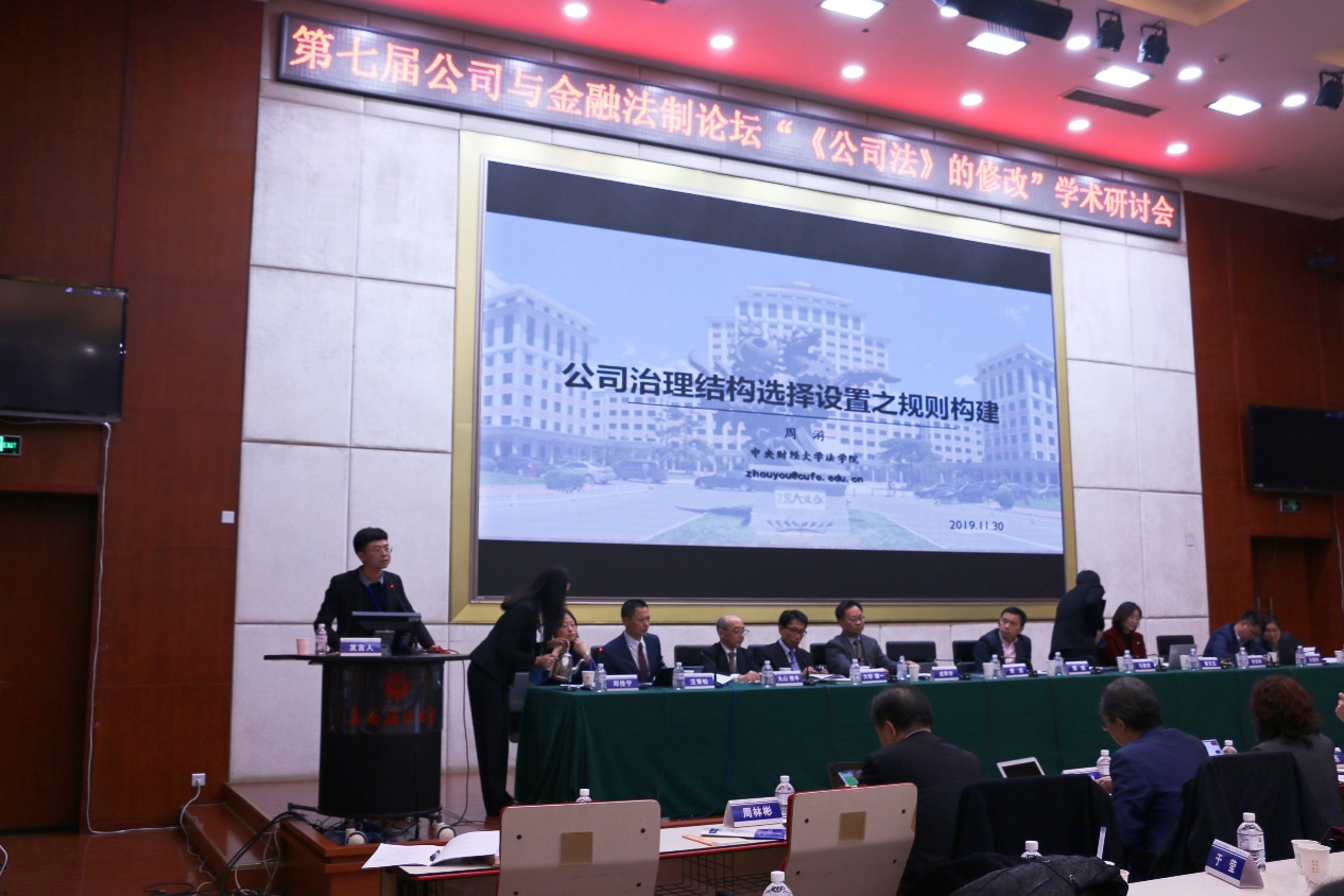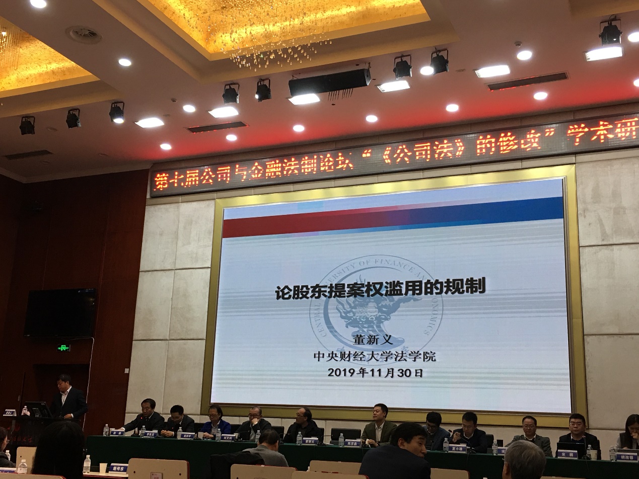 2019年11月30日,第七届公司与金融法制论坛暨“《公司法》的修改”学术研讨会在重庆召开。本次会议由中国商法学研究会、西南政法大学主办,西南政法大学民商法学院、西南政法大学公司治理法律问题研究中心、西南政法大学中国金融与保险法律研究中心共同承办。来自北京大学、清华大学、中国人民大学、香港大学、澳门科技大学、日本中央大学、韩国圆光大学、重庆市高级人民法院等高等院校及实践部门的代表参加了本次论坛,我院董新义副教授、周游博士受邀出席。