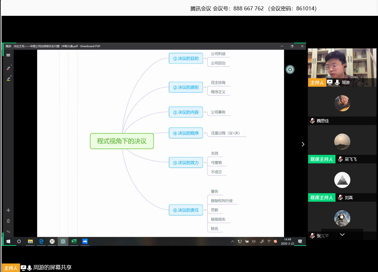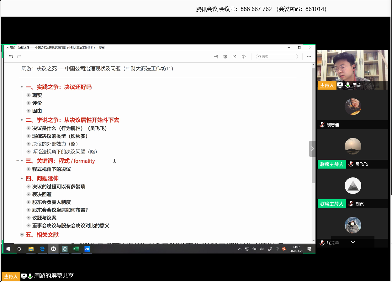 2020年3月22日下午,商法工作坊2020年第3期(总第11期)在直播平台以线上交流与讨论的方式举行。西南政法大学经济法学院吴飞飞副教授、中央财经大学法学院殷秋实副教授作为特邀嘉宾,中央财经大学法学院周游副教授作为指导老师,就“公司决议”之议题展开讨论。工作坊主要由指导老师引导、发言人展示、成员及其他与会者提问及评价、评议人评议、特邀嘉宾发言、指导老师总结等环节组成。此次线上活动共有70余名校内外师生及业界人士参与讨论。