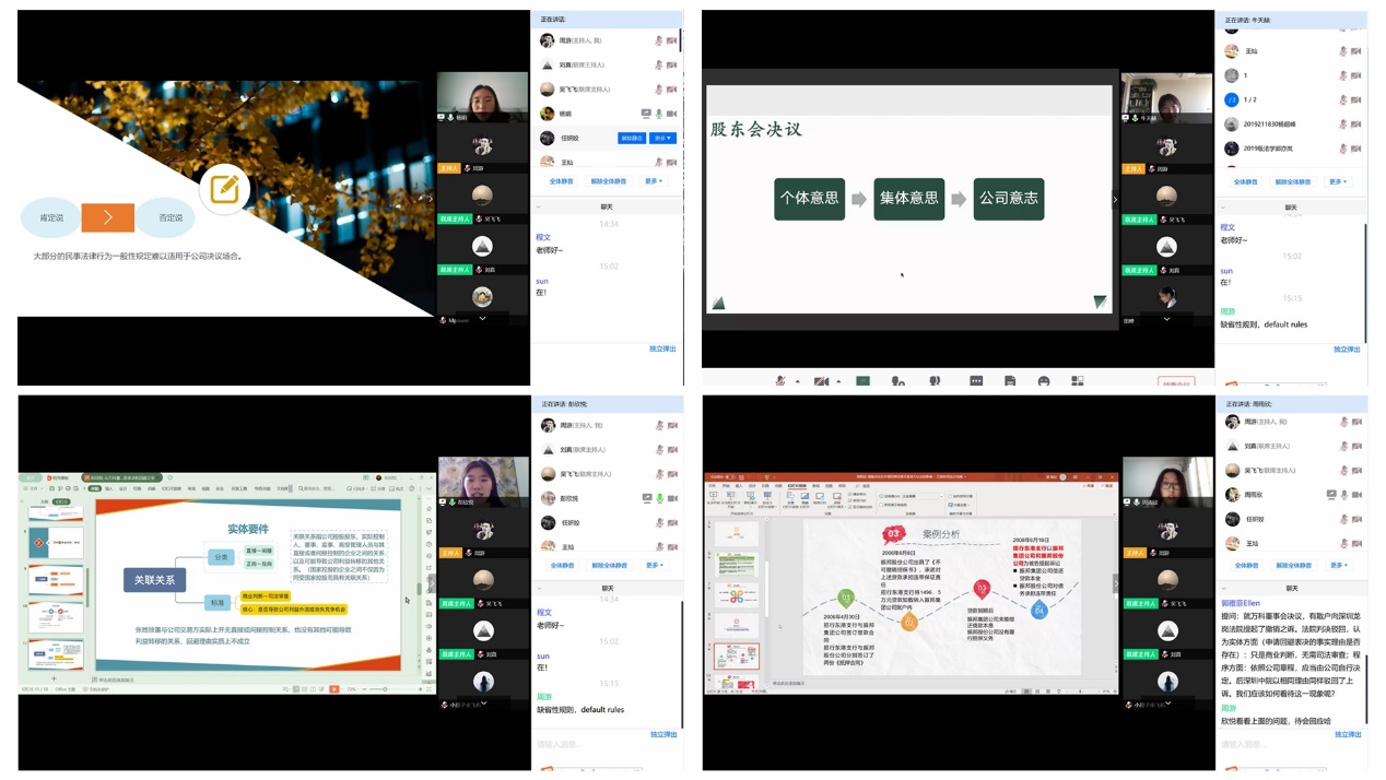 紧接着是嘉宾发言环节。吴飞飞副教授高度赞赏商法工作坊线上交流的形式,继而提出对于股东协议与公司决议在效力规则上的冲突问题的探讨必须深入到法理层面,指出在民法理论上的瑕疵规则与公司决议争议问题的对接上,应当先寻找共性继而讨论决议问题的特殊性;他还认为,决议不成立的设置完善了法律规则体系,有利于解决决议可撤销情形对当事人救济不足的问题,提出了决议是否应当存在生效程序的问题。殷秋实副教授指出,决议问题从民法的视角出发是将决议视为法律行为进行讨论,民法或可作为技术工具在法律适用有参考意义,但在实际理解和适用上不免存在解释空间,应当灵活运用;他进而提出,虽然实务中解决纠纷很少探讨基础理论,但对于决议问题的深入研究涉及对于公司本质的讨论,利益衡量的角度是讨论的起点,在论证应当阐明具体理由,并鼓励同学们辩证看待法院的判决。