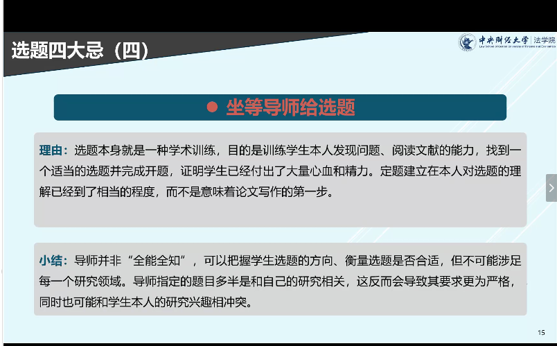 选题是论文写作的开始,也是论文写作能否写好的需要闯过的第一关。因此在选题过程中,简爱博士告诫大家:一是不要轻易批判立法,以及提出完善立法建议(盲目创新),因为立法专家几乎是多年从事相关法研究、实践的资深专家,法律的制定需要考虑社会影响、数据统计情况以及与其他法律的衔接;二是尽量并不选择学界已经充分讨论、反复论述过的论题,因为这类论题已经属于“甘蔗渣”,几乎没有研究新意;三是避免大而化之、面面俱到,因为对于毕业论文而言,要求具有一定创新性,而非对主题的综述,切忌无意义拼凑和“假大空”写作;四是不要坐等导师给选题,因为选题本身是一种学术训练,目的是训练学生发现问题、阅读文献能力,从而选择一个适当选题并完成开题,同时导师并非“全能全知”,导师给出的题目并不一定与学生的研究兴趣、研究能力相符合。简爱博士以刑法学研究为例,将选题偏向分为四大类:一是热点案例横向、纵向分析;二是新题与小题深做;三是旧题新作;四是脑洞大开。并进一步对刑法学论文的相关选题进行了分析,借此为同学们指引如何选择好的题目。