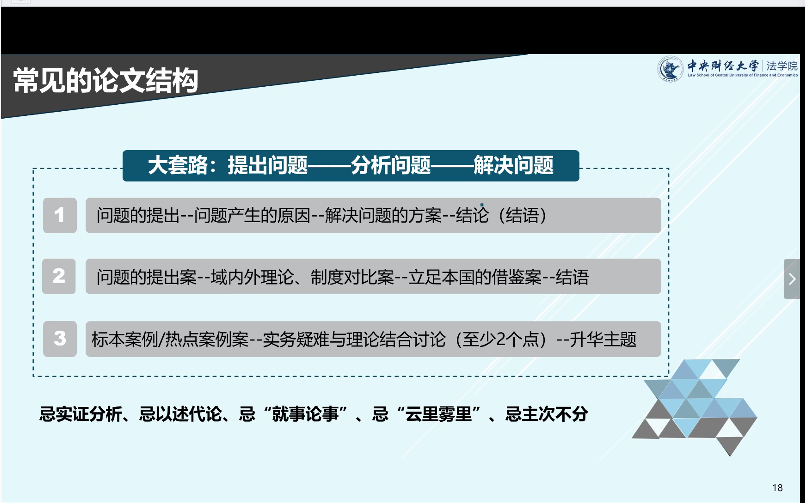关于论文结构,简爱博士指出,论文结构主要的大套路就是“提出问题——分析问题——解决问题”。第一种论文结构形式表现为:“问题的提出——问题产生的原因——解决问题的方案——结论”,这一逻辑比较通畅,是论文写作中比较普遍的结构;第二种论文结构为比较分析法:“问题的提出——域内外理论、制度对比案——立足于本国借鉴——结语”,这一结构虽有比较,但是最终还是要回到我国的立法实践;第三种论文结构即“标本案例——实务疑难与理论结合讨论——升华主题”。同论文选题一样,论文结构也要切忌实证分析、以述代论、“就事论事”、“云里雾里”、主次不分。