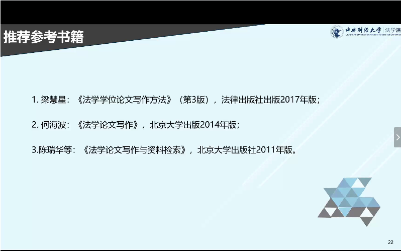 讲座最后,简爱博士向同学们推荐了三本有关论文写作的方法论书籍:梁慧星老师的《法学学位论文写作方法》,何海波老师的《法学论文写作》以及陈瑞华等老师的《法学论文写作与资料检索》,并介绍了核心法学期刊,以期为同学们的论文写作有所助益。