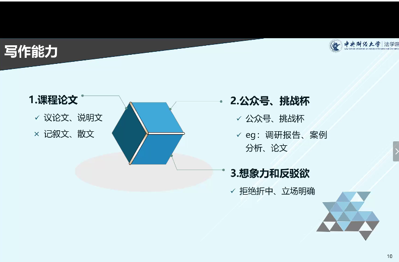 最后,所谓写作能力,这是关乎论文写作的质量,前面两种能力培养正是为写作能力的提高做铺垫。简爱博士谈到,在平时的学习生活中,同学们可以通过课堂论文与挑战杯等论文比赛来锻炼其写作能力,提高自己文字运用能力。但是对于论文写作而言,论文应该是议论文、说明文的形式呈现,而非是记叙文、散文。同时,关乎写作能力中的重要一点在于在遵守相关原则的前提下,要保持想象力和反驳欲,拒绝折中说,坚持论文写作立场明确。