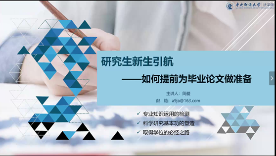 2020年3月30日,我院简爱博士分别于上午10点和晚上7点30分,为学院全体师生带来了两场疫情期间“独特”的讲座,讲座主题为“如何提前为毕业论文做准备”。本次讲座作为中财法学院2019年—2020学年“新生引航工程”系列讲座之二,吸引了众多师生聆听,院党委副书记徐颖研究员、周游副教授、殷秋实副教授,各年级辅导员及全体2019级本科生和硕士研究生新生共计400余人,通过腾讯会议软件共同学习探讨提前准备法学毕业论文的方法。