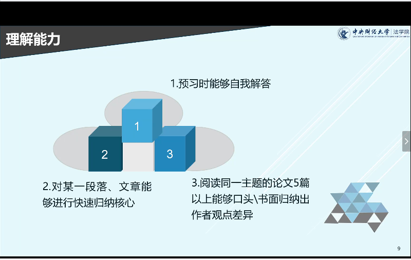 其次,所谓理解能力,简爱博士认为需要做到以下三点以慢慢培养自己的理解思维与能力:第一,即在预习时能够自我解答;第二,能够对某一段落、文章进行快速归纳核心;第三,阅读同一主题的论文5篇以上能够口头、书面归纳出作者观点的差异,这纳入了自己对文章的分析能力,有助于透过现象看本质。