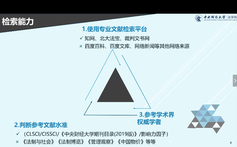 首先,所谓检索能力,简爱博士提到,需要具体关注三个方面:第一,使用专业文献检索平台,如北大法宝、知网、裁判文书网,尽量不要在论文写作中引用百度百科等其他网络来源,以提高文章的规范性;第二,学会判断参考文献水准,如CLSCI/CSSCI等影响力因子高的期刊,一般认为是好的期刊,坚决杜绝质量不高的期刊;第三,学会参考学术界权威学者的文章、观点,能保证论文的论证方向“不走偏”,发现问题,并学习其中的写作框架。