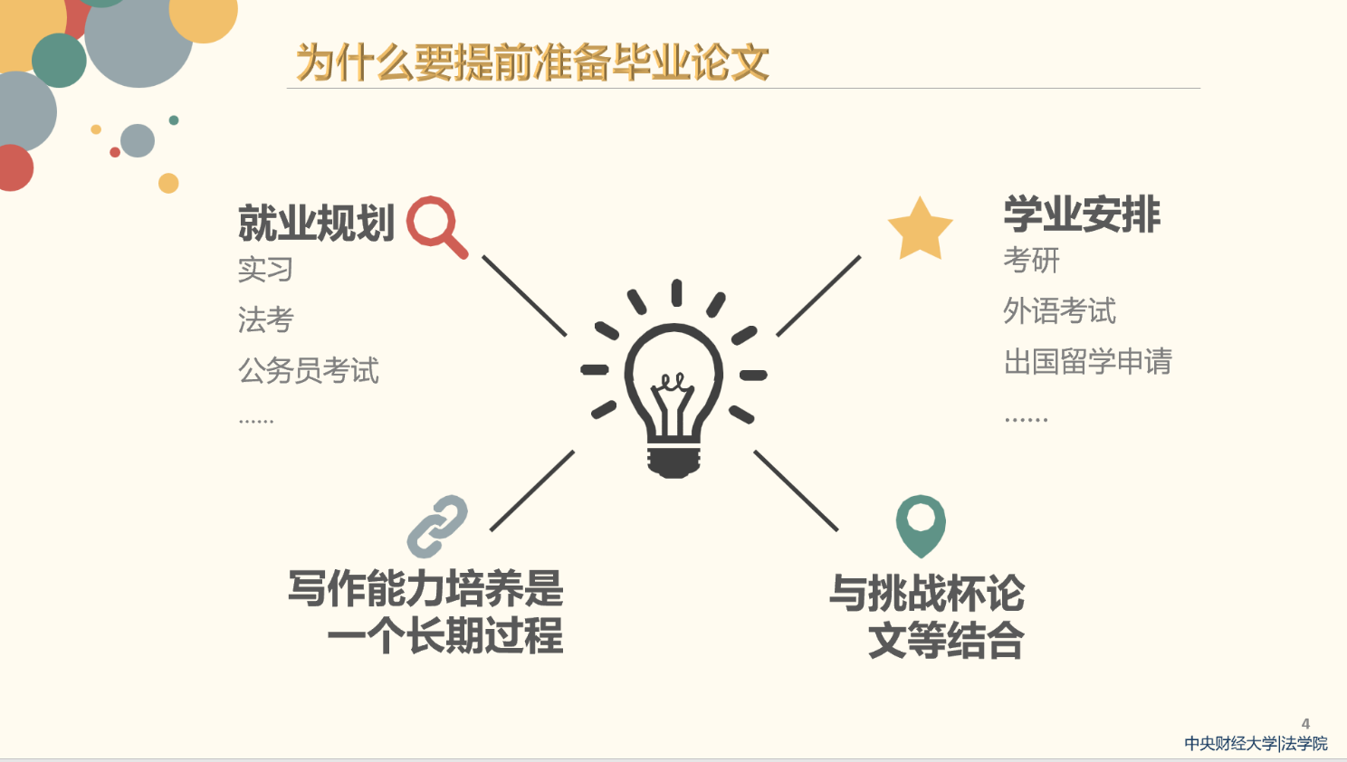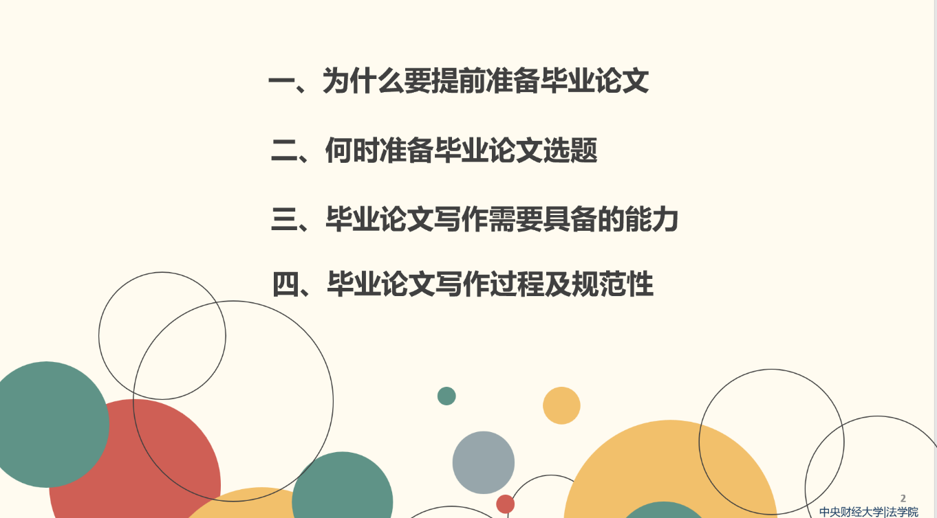 就提前准备毕业论文的原因,简爱博士指出,目前到毕业间隔时间不长,提前准备论文具有必要性。具体而言原因有四:一是大学生活基于高密度的就业规划、实习、法考等,应该提前规划;二是学业安排的准备方向多样化,如考研、外语考试、出国留学申请等,提前准备毕业论文可为后期学习预留时间;三是论文写作和挑战杯等大赛都要求学生掌握文字的基本功;四是写作能力培养是一个长期的过程,规范写作能力养成,论文选题等需要长期规划。简爱博士强调,毕业论文写作之所以如此重要,是因为它是专业知识运用的检测、科学研究基本功的塑造以及取得学位的必由之路。