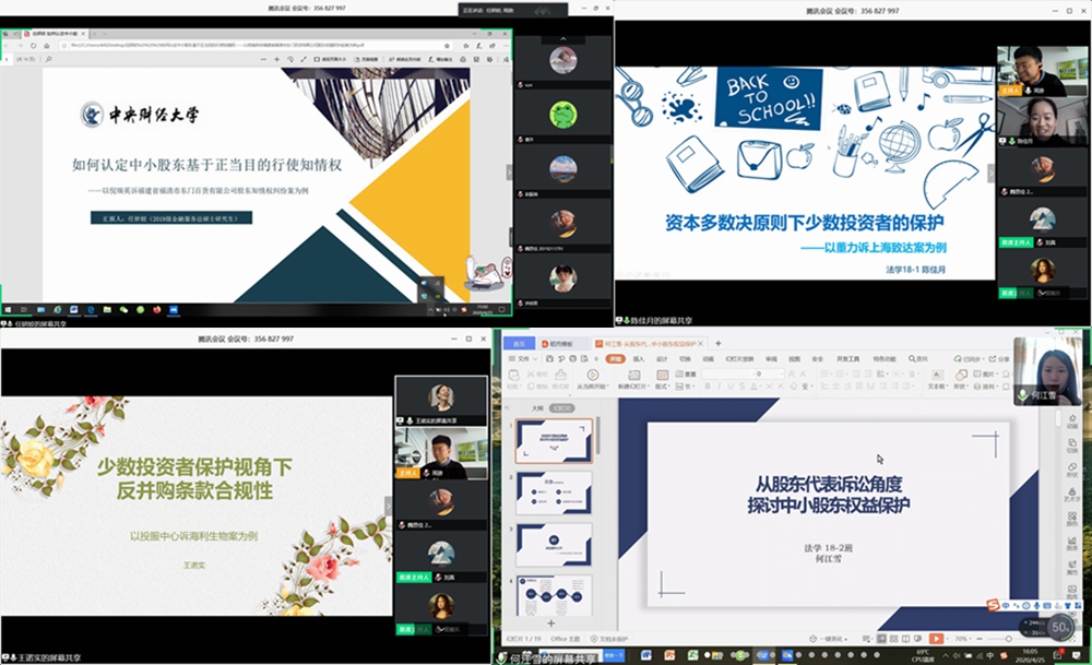 在发言人展示环节中,我院2019级研究生任妍姣以及2018级本科生陈佳月、何江雪,还有2018级中公财本科生王诺实分享了各自的研究体会。陈佳月同学以董力诉上海致达案为例,聚焦资本多数决原则下少数投资者的保护,具体分析救济途径,并提出了资本多数决原则下保护少数投资者的两点缓和办法。王诺实同学则通过万宝之争引入少数投资者保护视角下反并购条款合规性的话题,重点介绍了投服中心诉海利生物案,细数了目前应用于反并购的具体措施,提出对于反并购合规性空白领域的可行解决方案。任妍姣同学以倪瑞英诉福建省福清市东门百货有限公司股东知情权纠纷一案为切入点,探讨如何认定中小股东基于正当目的行使知情权的问题,详细归纳了股东知情权的行使方式、内容范围与程序条件以及“正当目的”的认定。何江雪同学从江西省首例股东代表诉讼案入手,从股东代表诉讼角度探讨中小股东的权益保护,结合世行营商环境评价指标,分析保护中小投资者的必要性,总结股东代表诉讼的制度功能,并延伸提出了完善建议。