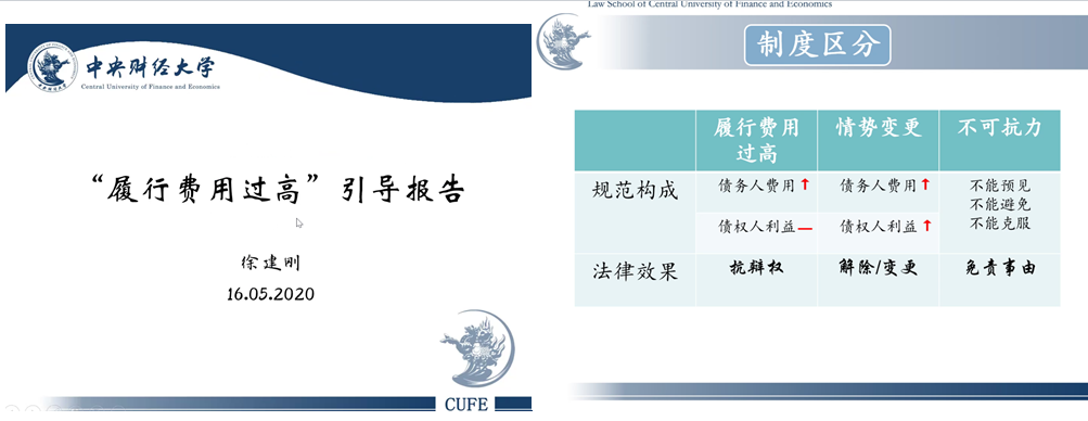 活动开始阶段,徐建刚博士从框架和体系上对履行费用过高的构成要件、法律效果以及与情势变更和不可抗力制度的区分进行了介绍。首先提出履行的对象、费用的范围以及过高的标准等构成要件在认定时需要考虑的要素。其次以请求权基础的思维对法律效果进行分析,并结合《德国民法典》第275条对我国《合同法》第110条的规范内容提出质疑。最后以表格明确展示了履行费用过高与情势变更和不可抗力制度在规范构成和法律效果上的区别。