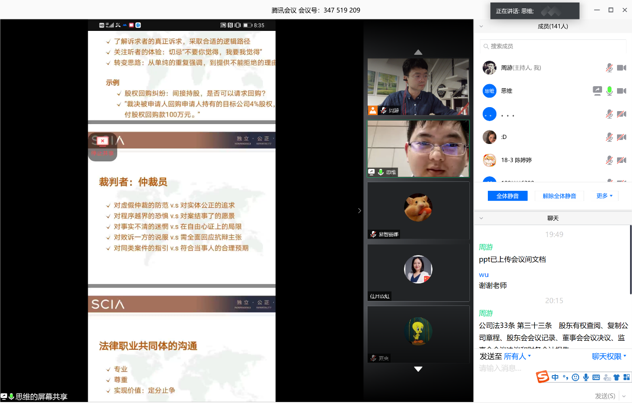 2020年5月14日晚上,深圳国际仲裁院案件管理一处副法律顾问陈思维先生受邀以线上方式为同学们带来主题为“商事仲裁策略技巧”的讲座,我院商法教研室副主任周游副教授主持。这是我院18级本科生法律诊所课程的组成部分,也是商法学研究工作坊系列活动之一,140余名本科生、研究生参加了本次活动。