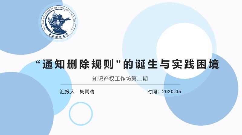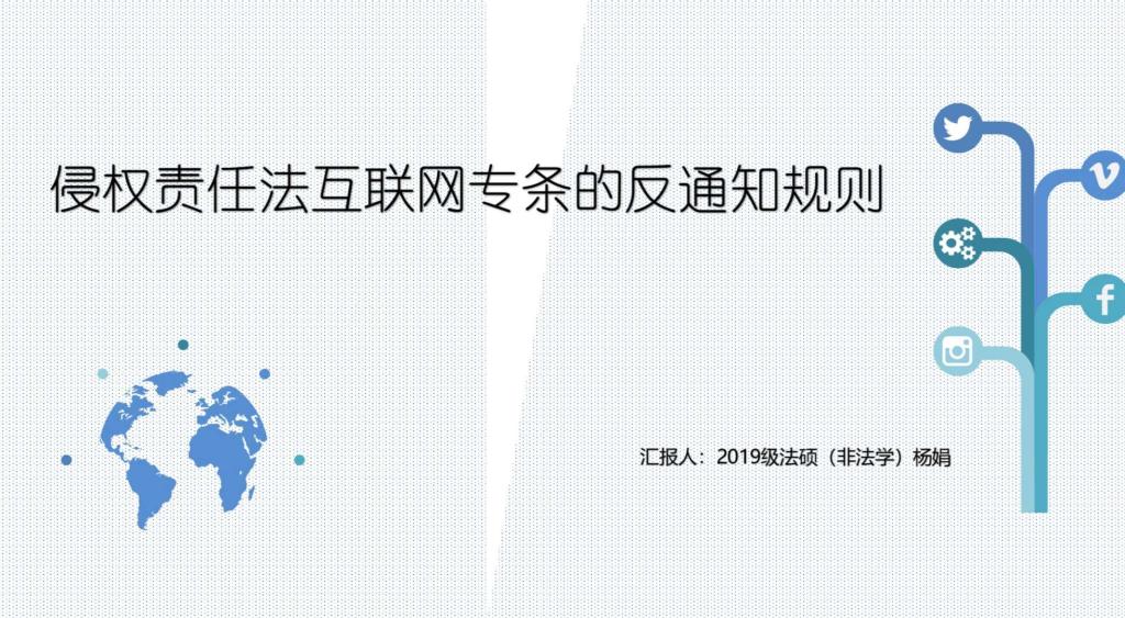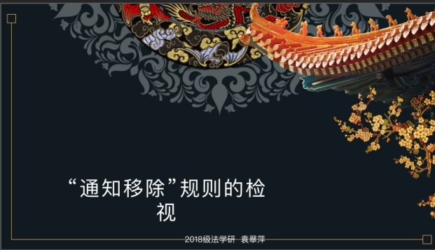 接着,在主报告人分享环节,我院2019级硕士研究生杨雨晴、2016级本科生童锐、2018级本科生袁翠萍、2016级本科生刘斯宇以及2019级硕士研究生杨娟依次分享了各自对通知删除规则的理解及观点。杨雨晴同学以“通知删除规则的诞生与实践困境”为题分别阐述了通知删除规则的产生、基于实证分析的实践困境两个问题,总结了通知删除规则虽在运行实践中产生出较多困境,但较之诉讼,其仍为权利人提供了更为廉价便捷的维权替代方案。童锐同学以“著作权侵权中的‘通知-删除’规则的适用”为题,介绍了通知删除规则的产生及在我国的引入,说明了通知删除规则在著作权侵权中的适用,还提出了完善该规则在实践中运用的建议。袁翠萍同学以“‘通知移除’规则的检视”为题,首先介绍了Jennifer Urban教授和Brianna Schofield教授通知移除规则实证分析的结论,随后对比BruceBoyden教授对此的不同观点,并结合我国学者的分析、欧盟相关政策的实施以及美国通知删除规则的最新发展,详细地阐述了通知删除规则在实践中的运行情况。刘斯宇同学以“‘通知-删除’规则在我国的适用与修正”为题,以“小程序案”与“阿里云案”为例,介绍了对我国通知删除规则在司法实践中的发展。杨娟同学以“侵权责任法互联网专条的反通知规则”为题,在介绍了DMCA中反通知规则之后,结合对《侵权责任法》第36条的理解,提出了该条款可以延伸解释出包含了反通知规则。