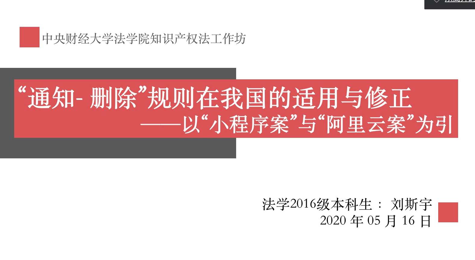 2020年5月16日下午,知识产权工作坊2020年第2期在直播平台上以线上交流与讨论方式进行,此次活动的主题是:通知删除规则的前世今生。特邀嘉宾上海财经大学法学院讲师蔡元臻博士、国家知识产权局知识产权发展研究中心研究员顾昕博士,南开大学法学院讲师谢晴川博士、新浪网法务部高级法务王磊、工作坊指导老师我院张金平博士参与了本次活动。工作坊主要由指导老师引导、报告人展示、评议人评议和提问、特邀嘉宾发言、指导老师总结等环节构成。此次线上活动共有46名校内外师生及业界人士参与。