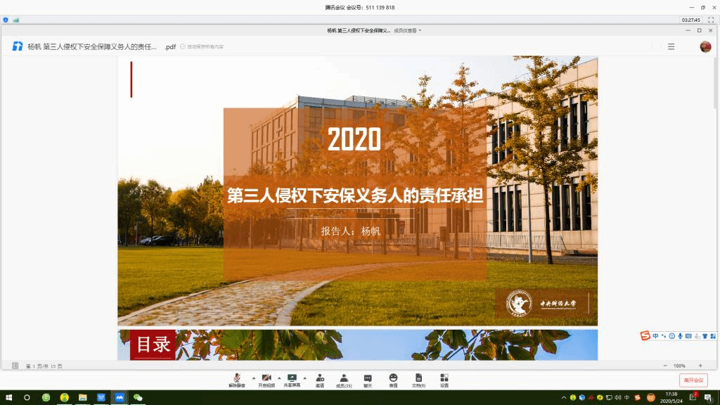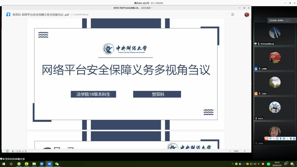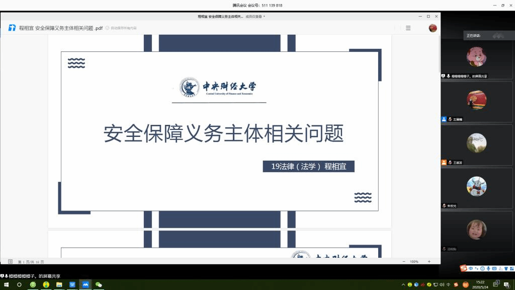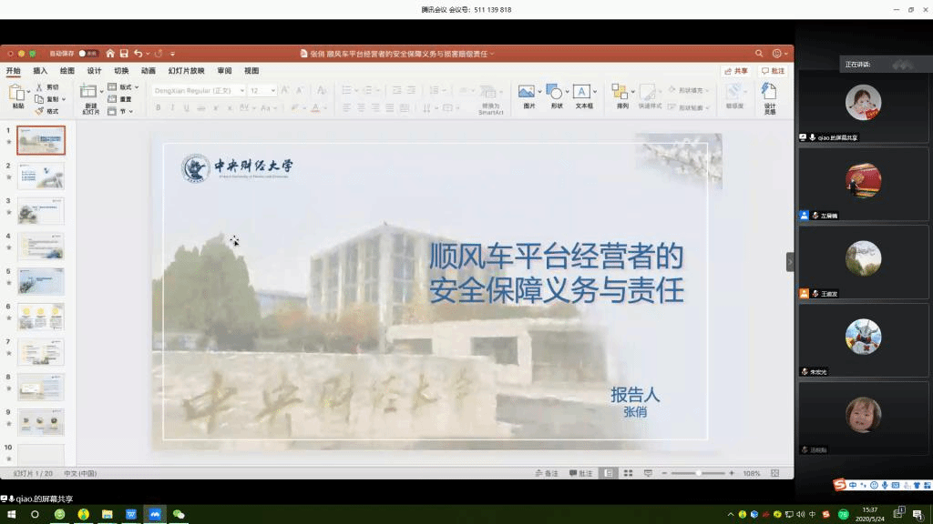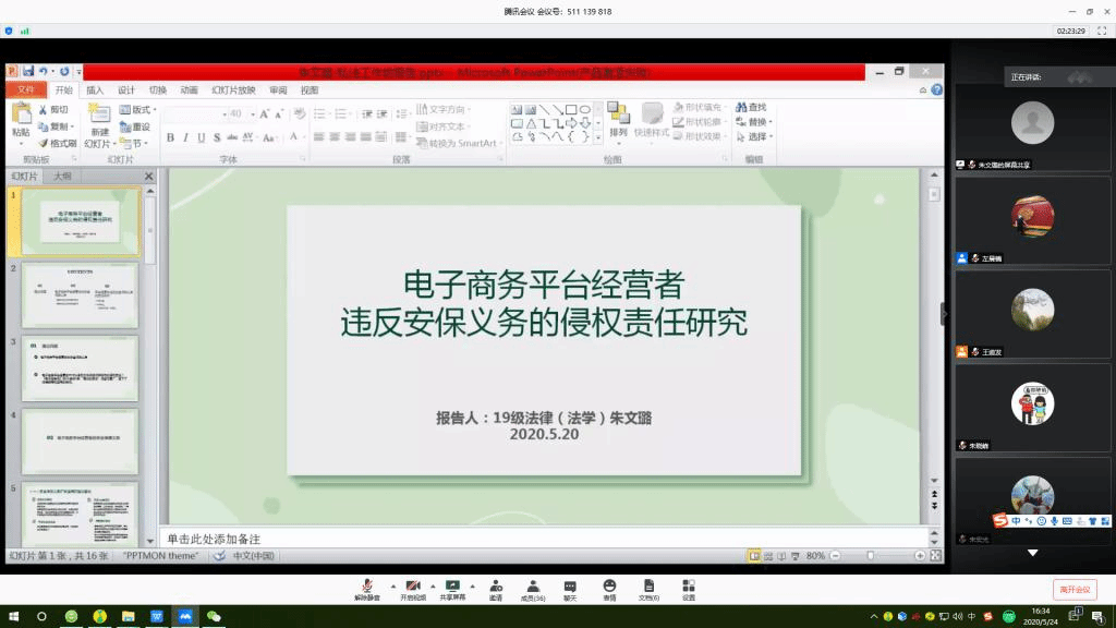 2020年5月24日下午,我院第20期私法工作坊以在线会议的方式如期举行。活动由我院王道发博士主持,朱晓峰副教授、王叶刚副教授、武腾副教授和徐建刚博士作为指导老师参与了本次活动。工作坊活动主要由指导老师引导、发言人展示、其他成员评议、自由讨论以及指导老师总结等环节构成。本次活动共有30余名师生参与报告与讨论。