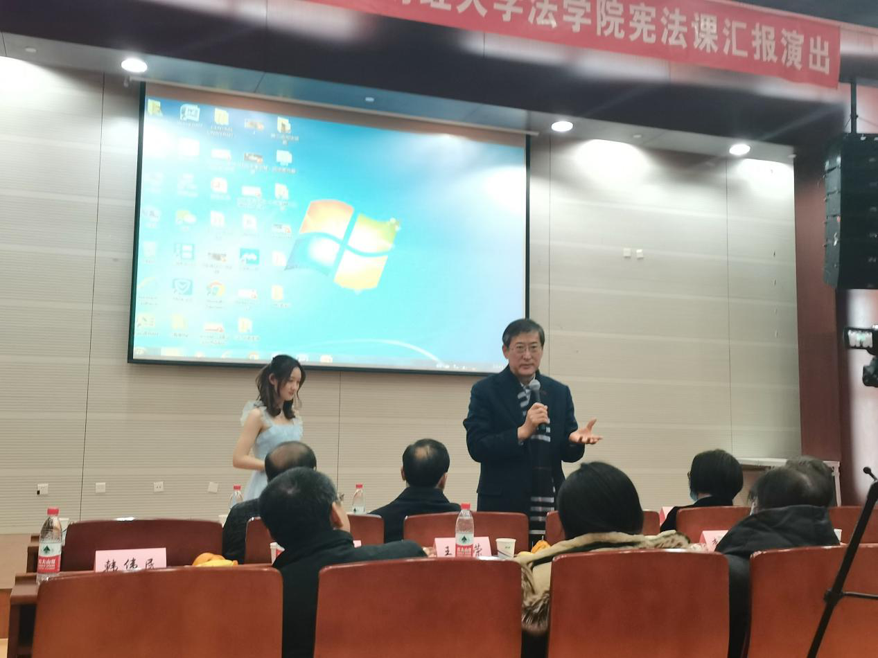 本次汇报演出分为六个环节。首先,《宪法》授课教师蒋劲松教授简话演出来由。蒋教授向大家定义并诠释,学术性(宪法学)系列微话剧“《喷薄·2020》的演出是我院学习宪法课的硕士生的非营利性课程实践活动。它将法学与话剧艺术相结合,形成宪法课教学方式的一种改革。蒋教授指出,今年先后发生的中国最先控制住新冠疫情、香港某些高校学生卷入乱港活动、美国政客奥布莱恩和蓬佩奥直接攻击中国宪法所规定的中国共产党领导这些现象有一个共性,即它们都是宪法现象。它们呼唤中国高校的宪法课程从内容到教学形式都作出必要的改革。内容方面,不但讲中外宪法的共通方面,更要彰显中国宪法中的中国特色,借以使中国高校的法学院学生既通各国宪法,更懂中国宪法,爱中国宪法,挺中国宪法中的中国特色。蒋教授认为中国高校宪法教育成功与否的标志不能仅是结课考试拿高分或者通过法律考试,除此之外还应有更高的标准,比方说面对蓬佩奥之辈对中国宪法的攻击,有能力用中国宪法中的中国特色予以迎击。形式方面也要改革。蒋讲授尝试将法学教育与话剧的编导排演嫁接,丰富同学们学习宪法的形式,让同学们学习宪法的过程不再沉闷,而是高兴地学、主动地学,进入情境地学,高频率地学。今天的演出主要是想给校内外领导、社会各界呈现一种态度,即在中国高校一定要着力学好中国宪法中的中国特色,而且学得快乐和昂扬。