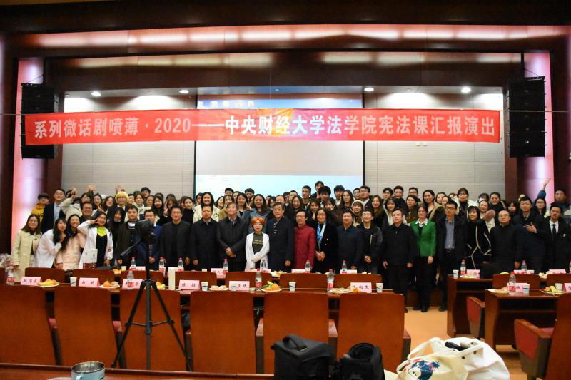 2020年11月29日上午9点,学术性(宪法学)系列微话剧《喷薄·2020》——中央财经大学法学院宪法课汇报演出在中央财经大学学院南路校区学术会堂202大厅拉开帷幕。学习《宪法》课程的2020级法律硕士(非法学)102名同学与6名学硕研究生共108名人,分为10个剧组,演绎了一场场别开生面的宪法场景。