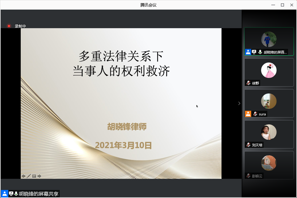 2021年3月10日,财税法工作坊第20期通过直播平台以线上讲座的形式举行,主讲人为胡晓锋律师,主题为多重法律关系下当事人的权利救济。本次讲座由工作坊指导老师郭维真副教授主持,我院部分2020级和2019级硕士研究生参加了此次讲座。