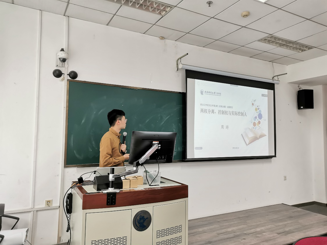 2021年3月31日下午,本年度商法工作坊第1期(总第16期)在中央财经大学学院南路校区中财大厦案例教室1举行。此次活动主题是研读《所有权与控制权:英国公司演变史》一书以及讨论“实际控制人”议题。西南政法大学民商法学院林少伟教授作为特邀嘉宾,中央财经大学法学院周游副教授作为指导老师参与了本次活动。工作坊主要包括指导老师引导、特邀嘉宾分享、发言人展示、参会者提问、发言人答疑以及指导老师总结等环节,并穿插抽奖赠书活动。此次活动共有60余名校内外师生及业界人士以线上、线下相结合方式参与讨论。