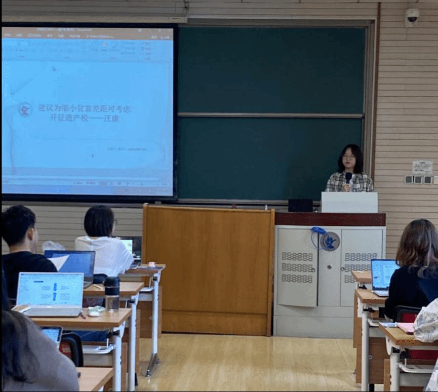 2020级法律硕士研究生曹译之同学就“遗产税开征问题”进行了主题发言。首先,她介绍了目前我国征收遗产税的经济基础。其次,她对世界各国征收遗产税的方式进行了分析,介绍了遗产税具体制度,包括总遗产税制、分遗产税制和二者结合的税制。最后,她通过正反两方面分析了遗产税的作用,结合我国具体国情,对我国开征遗产税的可行性提出了分析和建议。