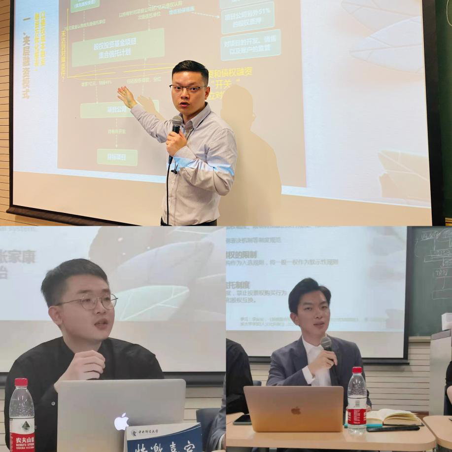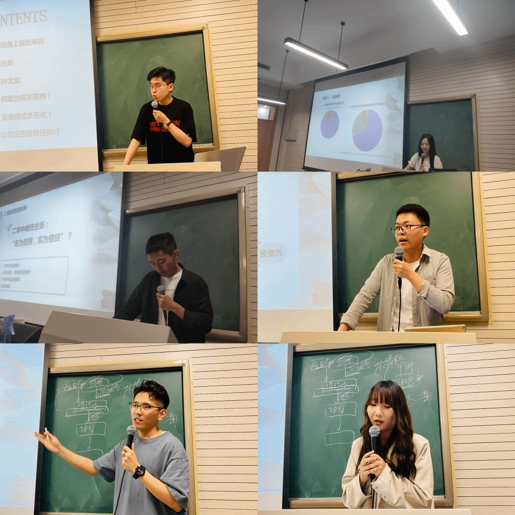 随后,进入发言人展示的主要环节。中央财经大学法学院2020级研究生李昭霖和周家平、2018级本科生任子怡、2019级本科生王长豫和时海腾以及2020级本科生张家康等六位同学对议题进行了介绍和分享。周家平同学指出《公司法》第四条、第一百二十六条、第一百八十六条在理论上对股、债进行了条理清晰的界分,但在实务中融资手段层出不穷,故造成了股债融合的法律困境;王长豫同学分析了“嘉悦案”,并指出“嘉悦案”本质上为名股实债,以投资为名行借贷之实;张家康同学分析了“夏仲文案”,并指出根据该案二审判决显示,法院裁判结果认定该案为名债实股,实质为共同投资的法律关系;时海腾同学对“嘉悦案”与“夏仲文案”存在同案不同判的原因进行了辨析,对两案的裁判依据以及裁判背后的考量进行了对比,并得出股权债识别要素探究的小结;李昭霖同学提出在实务中,交易模式更加多元化与复杂化,并简要介绍了三种常见的交易模式,分别为:夹层融资模式、分级基金模式、资产收益权产品模式;发言最后,任子怡同学讲述了如何用公司法回应路径探析股债识别,并对团队的发言进行了总结。