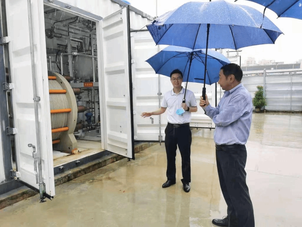 (图:凯豪达公司副总经理陪同曹富国教授参观电解水制氢设备)