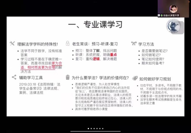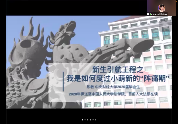 2021年10月30日19点20分,我院举办2021级本科生“法学专业与法律职业”课程暨新生引航工程系列讲座。本次主题是“朋辈经验分享之我是如何度过小萌新的‘阵痛期’”,由我院2020届本科优秀毕业生陈敏主讲,法学院全体2021级本科生参加。