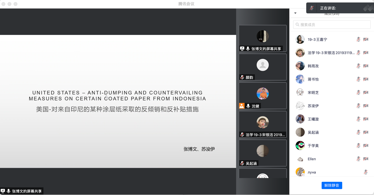 2019级涉外班张博文、苏浚伊同学对“United States - Anti-Dumping and Countervailing Measures onCertain Coated Paper from Indonesia, WT/DS491/R”进行了评述。美国商务部(USDOC)和美国国际贸易委员会(USITC)经过反倾销反补贴调查后发布决定,对从印尼某种涂层纸征收反倾销和反补贴税。专家组进行如下分析:第一,关于USDOC补贴决定的争议。专家组根据SCM协议第14条(d)项关于政府垄断的规定,讨论印尼政府是否对国内常备木材和原木价格垄断,判断USDOC不使用印尼国内市价作为基准价格是否合理;根据第12.7项关于缺失信息合理替代的规定,分析USDOC认定奥尔良的购买行为是否构成债务回购依据的信息是否合理替代缺失信息;根据第2.1条(a)项和(c)项关于补贴资格限制的规定,分析USDOC对三种补贴的认定是否合理。第二,关于USITC损害威胁决定的争议。专家组对影响美国国内工业的“其他因素”进行分析,认为USITC没有将其造成的不利影响归因于受试进口,因此没有违反反倾销协议第3.5条和SCM协议第15.5条;专家组支持了USITC关于调查结果的解释,认为其不是对尚未明确的事实的猜测,没有违反反倾销协议第3.7条和SCM协议第15.7条;印尼以前两项索赔为前提的关于反倾销协议第3.8条和SCM协议第15.8条的索赔没有提出新的论点,专家组不予支持。第三,对1930年美国关税法第771(11)(B)条(“平局投票”条款)的质疑。专家组认为反倾销协议第3.8条和SCM协议第15.8条规定的“特别注意”义务不适用于决策程序,因此“平局投票”没有违反此规定。沈健老师分别对两组的报告人提出了相关问题并对他们的评述进行了点评,并对胥艾璇同学的经验分享提出了感谢。沈健老师指出在阅读WTO案例时要注意对重要的争议点和推理进行“精读”,只有在读懂的基础上才能理解专家组和上诉机构的思路,作出有效的分析。
