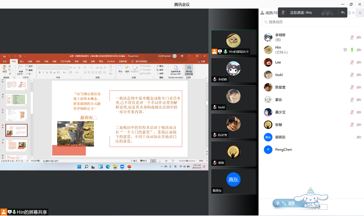 2021年12月9日中午,中央财经大学财税法工作坊2021-2022学年第五期(总第28期)活动在学院南路主教学楼909和线上腾讯会议同步举行。本期活动的主题为“德日税法通则的比较与借鉴”,由法律硕士研究生刘茗轩主持,法学院本科生张驰、刘家骏,硕士研究生刘茗轩、李明修、姜恒、包少卿、叶俊材、沈聪分别就各自主题进行汇报与评议。华中科技大学法学院李貌老师、中央财经大学法学院郭维真老师,应邀出席。华中科技大学和中央财经大学两校研究生、本科生三十余人通过线上会议和线下会议的方式参加本次活动。
