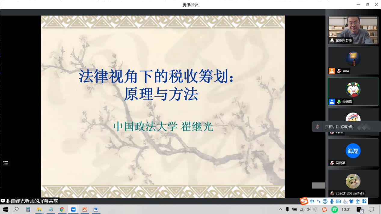 2022年4月6日,中央财经大学财税法工作坊第31期通过直播平台以线上讲座的形式举行。此次讲座的主讲人为中国政法大学翟继光教授,主题为“法律视角下的税收筹划:原理与方法”,本次工作坊由2021级法律硕士李明修同学主持,工作坊指导老师郭维真副教授和我院2020级、2021级部分研究生参加了本次工作坊。
