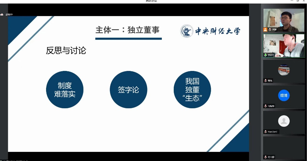 2022年4月13日下午,中央财经大学商法学研究工作坊2022年第四期(总第26期)以腾讯会议为平台,采用线上交流的形式举办。本次活动的议题为信义义务。本期工作坊参考书目的作者浙江大学光华法学院周淳副教授、我院殷秋实副教授受邀参加了本次活动,我院周游副教授对活动进行了全程指导。工作坊主要由嘉宾对会议主题进行介绍与拓展、研究团队围绕主题进行展示、指导老师点评、指导老师对评议团队进行提问、评议团队回答提问、评议团队提问发言团队、发言团队回应与自由讨论、特邀嘉宾与指导老师回应成员提问等环节构成。本次线上商法工作坊共计有60余位校内外师生及业界人士参与讨论。