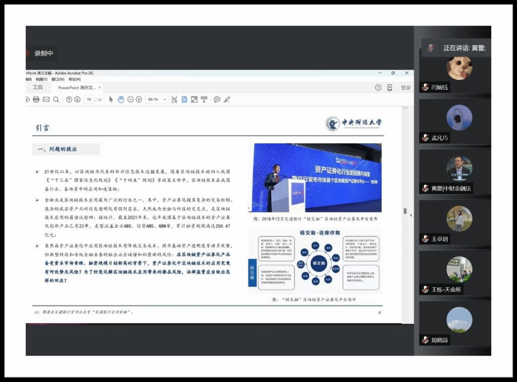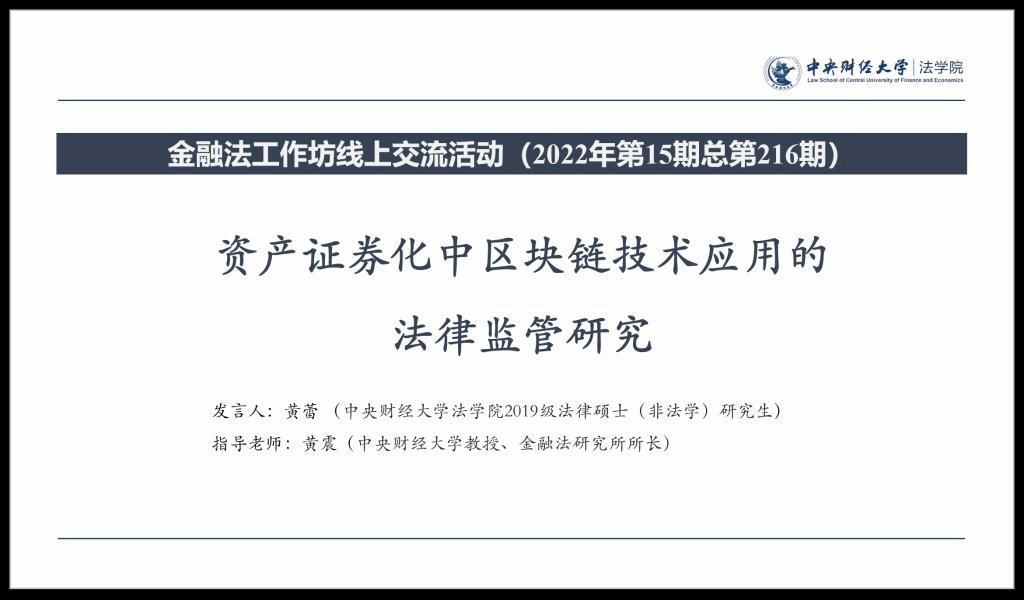 2022年4月16日上午,中央财经大学金融法工作坊2022年第十五期(总第216期)以腾讯会议为平台,采用线上交流的形式举办。本次活动的主题为“资产证券化中区块链技术应用的法律监管研究”。我院黄震教授对活动进行了全程指导,也邀请了数位校外的业界人士参会讨论。工作坊主要由主持人介绍,发言人分享,评议人评议,答疑与交流和指导老师点评与总结五大环节构成。