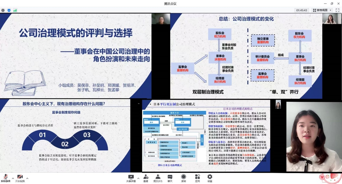 随后进入发言组展示环节,我院2021级硕士研究生孙呈玥、2020级本科生张子帆、2019级本科生郑淇媛、2021级硕士研究生吴俣菲代表发言组分享以“公司治理模式的评判和选择——董事会在中国公司治理模式中的角色扮演和未来走向”为主题的相关研究。第一部分,孙呈玥同学通过类案整理和个案分析的方式向大家展示了现阶段我国公司治理模式中董事会存在定位不明,职能混乱等现象,并就此引出我国公司治理模式中董事会应该扮演何种角色等问题。第二部分,张子帆同学以美国、德国和日本三个国家为例介绍了域外国家公司治理的基本模式和主要特点。首先张子帆同学对本期研读书目做简要梳理,后分别介绍美国、德国和日本公司治理模式的特点,通过进行对比分析总结出,日本公司治理结构分为传统监事制和委员会制,而委员会制与美国的单层董事制在股权结构、股东大会和董事会的职权划分以及监督激励机制上都具有高度的相似性,德国的垂直双层制与日本的传统监事制也有一定的相似之处。第三部分由郑淇媛和吴俣菲两位同学共同分享。郑淇媛同学首先通过《公司法》第22条第2款、第37条、第46条的规定介绍了学界对董事会中心主义和股东会中心主义的划分标准。并从董事会和监事会不同制度分析了其现存的问题。随后吴俣菲同学重点向大家展示了《公司法》修改草案的对比部分,总结出董事会中心主义在修订草案中的六点体现,提出我国公司治理模式已由“双层制治理模式”进入到“单、双”并行的模式。最后,吴俣菲同学指出是否能认为我国公司法修订草案确立了董事会中心主义的问题,并引用了周游老师在《从被动填空到主动选择:公司法功能的嬗变》一文中的核心观点进行回答:我国的公司治理模式之路正在从被动填空走向主动选择。