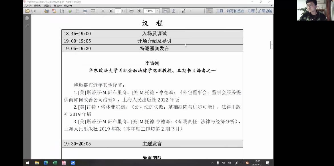 2022年4月27日晚,中央财经大学商法学研究工作坊2022年第五期(总第27期)采用线上交流的形式举办。本次活动的议题为公司治理模式的评判与选择——董事会在中国公司治理模式中的角色扮演和未来走向。本期工作坊参考书目《金融危机后的公司治理》的译者之一、华东政法大学国际金融法律学院副教授李诗鸿老师受邀参加本次活动,我院周游副教授对活动进行全程指导。工作坊主要由嘉宾对会议主题进行介绍与拓展、研究团队围绕主题进行展示、指导老师点评、指导老师对评议团队进行提问、评议团队回答提问、评议团队提问发言团队、发言团队回应与自由讨论、特邀嘉宾与指导老师回应成员提问等环节构成。本次线上商法工作坊共计有70余位校内外师生及业界人士参与讨论。
