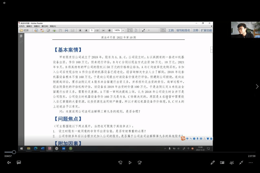 2022年5月22日下午3点,商法学研究工作坊季后活动第4场通过线上方式举行。商法研究团队2020级研究生崔安南、侯涵斌、郑岩、蔡晓灵,2021级研究生符大卿、孙呈玥、王天琦、黄凯旋,2022级准研究生袁旻晖、罗卿华、庞家毅、汪润之、郝世成、赵波旭、樊雨欣以及近70名法学院学生参加了本次研讨活动。本次活动涉及案例由深圳大学法学院蔡元庆教授提供,蔡老师也全程参与线上讨论,我院王湘淳博士以及商法工作坊指导老师周游副教授参与了本次活动。