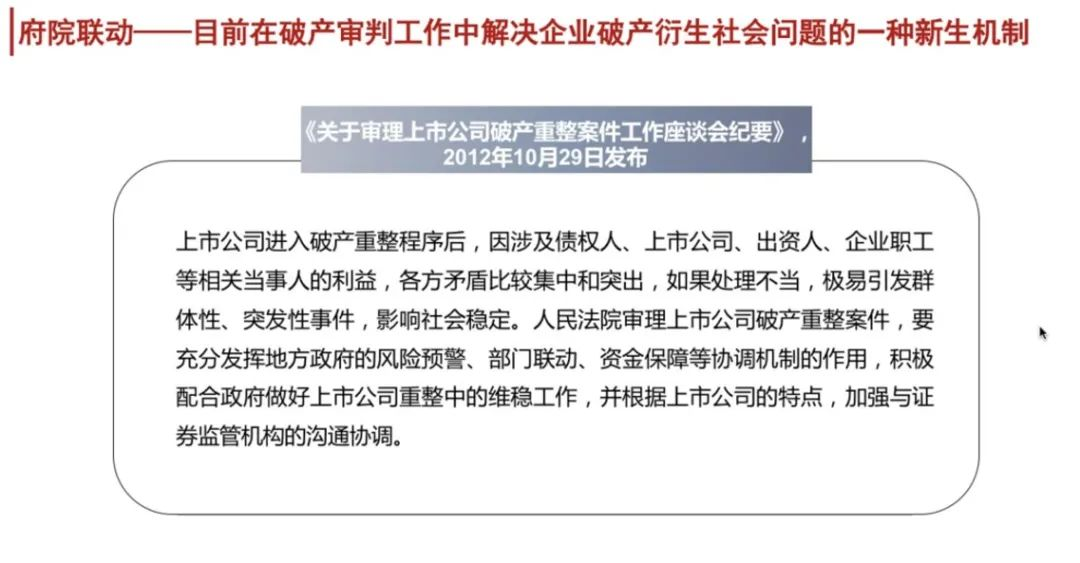 随后,申林平博士分享了《关于审理上市公司破产重整案件工作座谈会纪要》实施十年以来对府院协调机制的再认识,申博士以2012年座谈会纪要内容为切入点,理清了府院联动的定义、梳理出目前关于府院联动的相关规定、也指出目前市场的关注之处,他认为这是在目前破产审判工作中解决企业破产衍生社会问题的一种新生机制。