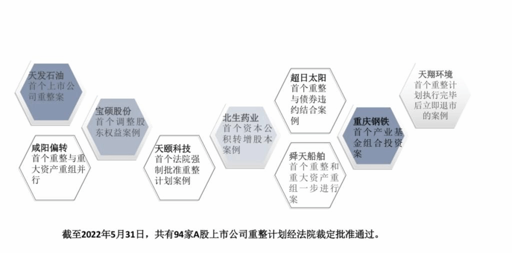 讲座伊始,申林平博士向大家简要分享上市公司破产重整多例“首个”经典案例。申博士指出,截止2022年5月底,已共有94家A股上市公司重整计划经法院裁定批准通过。