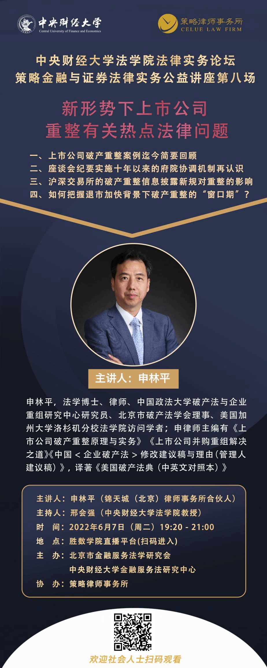 2022年6月7日,“策略金融与证券法律实务公益讲座”第八场成功举办。本次讲座邀请锦天城(北京)律师事务所合伙人申林平博士作题为“新形势下上市公司重整有关热点法律问题”的专题讲座,中央财经大学法学院教授邢会强教授主持。“策略金融与证券法律实务公益讲座”由北京市金融服务法学研究会、中央财经大学金融服务法研究中心主办,策略律师事务所协办。本次讲座采取线上方式举行,全程累计观看直播的网络用户达一万余人。