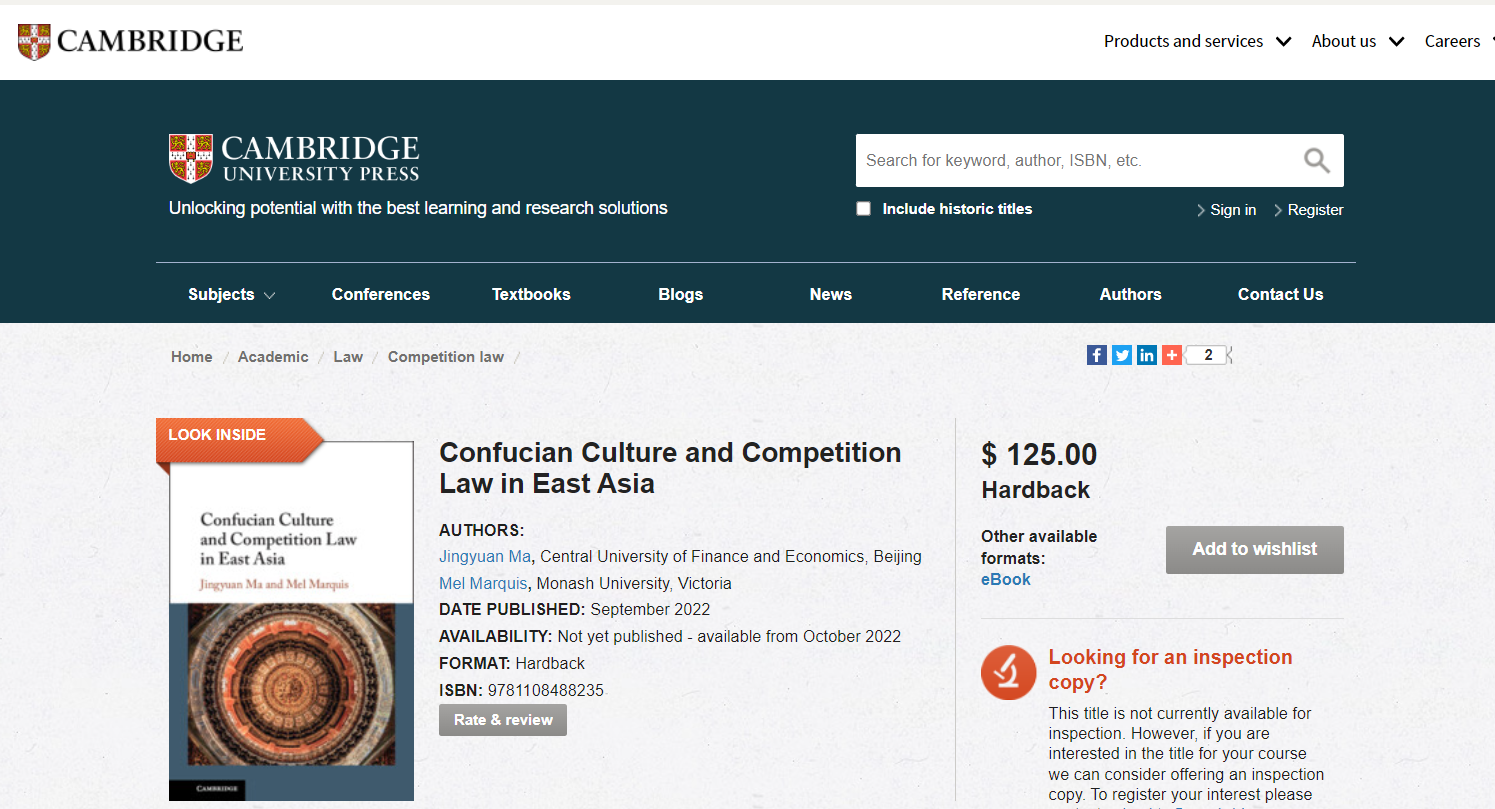 法学院马静远副教授英文学术专著《Confucian Culture and Competition Law in East Asia(儒家文化影响下的东亚反垄断法)》2022年9月由英国剑桥大学出版社出版。中央财经大学法学院马静远副教授为该书第一作者,第二作者是澳大利亚莫纳什大学Mel Marquis教授。该著作也是我校教师在该出版社出版的第一部学术专著。