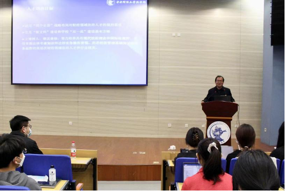 接着,尹飞院长着重介绍了我院财经法治人才培养体系。他强调,我院以一流专业、一流师资、一流科研为人才培养依托,建立了“一体二元四维六化”的人才培养模式,逐步完善“培养方向类型化、课程体系模块化、实践教学嵌入化、涉外交流双向化、一二课堂贯通化、核心价值浸入化”的人才培养路径。同时,尹飞院长分析了近年来我院毕业生的升学就业情况,并鼓励同学们积极开展财经法学研究,为日后的升学择业规划奠定良好的基础。