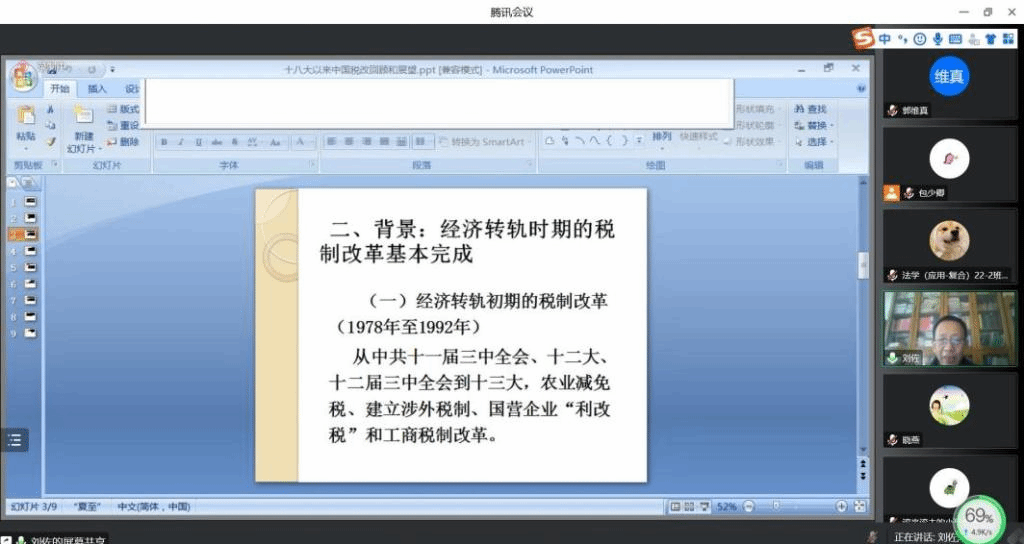 2022年11月8日下午,中央财经大学财税法工作坊第37期通过直播平台以线上讲座的形式举行。本次讲座的主讲人为中国法学会财税法学研究会副会长刘佐先生,主题为“十八大以来中国税制改革的回顾和展望”。本次工作坊由指导老师郭维真副教授主持,中央财经大学财经研究院副院长李向军老师、法学院副教授曹晓燕老师以及法学院部分本科生、硕士研究生、博士研究生参加了本次工作坊。