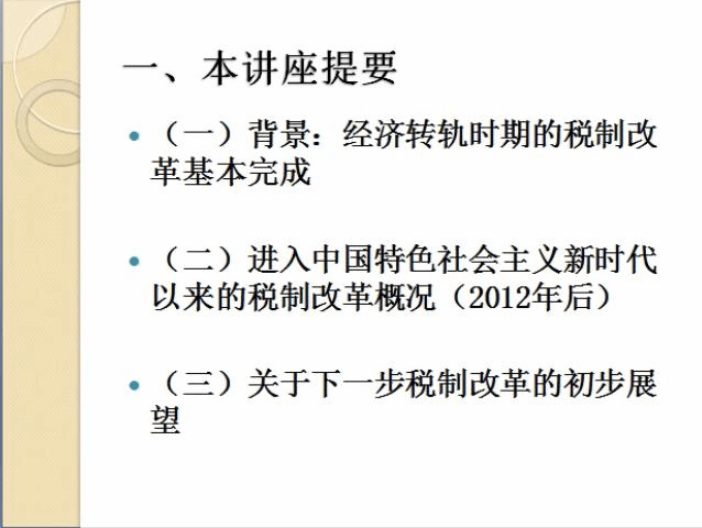 第一部分是关于十八大以来中国税制改革的背景问题。刘佐老师提到1949年新中国成立后我国实行计划经济,经济体制表现为生产资料所有制以公有制为主体,税收主要为城镇企业缴纳的工商税收和农村人民公社缴纳的农业税。进入改革开放之后,我国主要进行了两次大规模的税制改革,对于完善我国税收体制,推动经济发展发挥了重要作用。