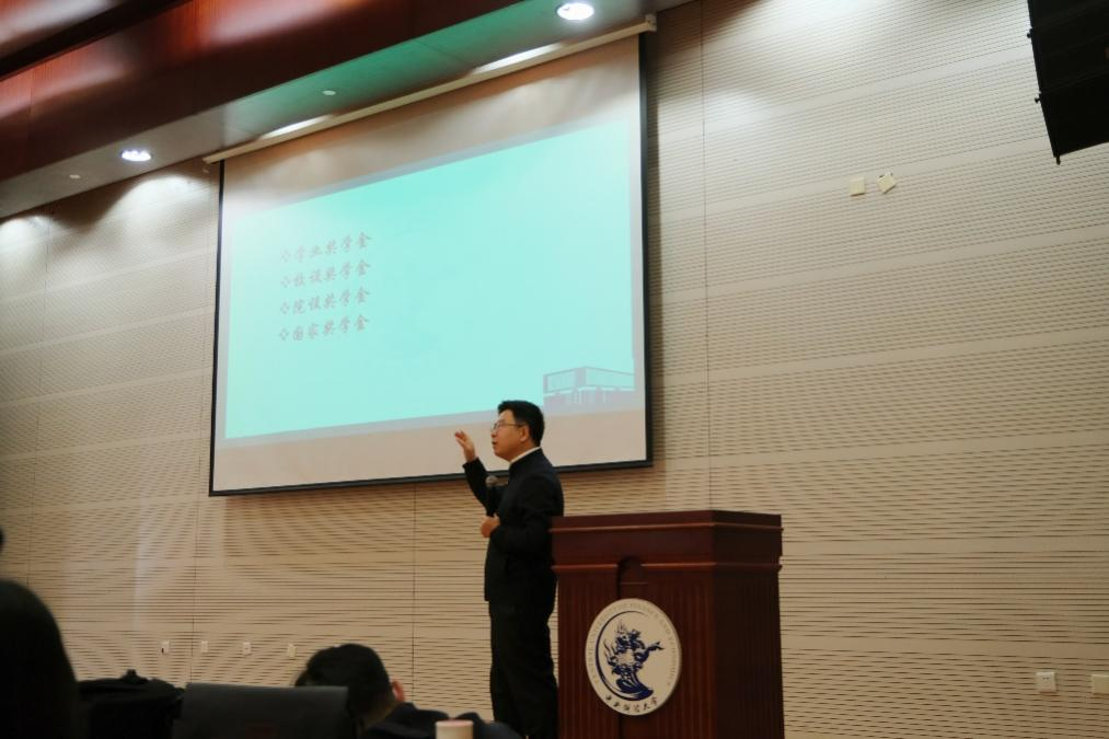 其次,李伟副院长学院评选学业奖学金、校设奖学金、院设奖学金、国家奖学金不同标准、要求和考虑。接着,李伟副院长以国家奖学金为例具体讲述学院的奖学金的评选标准,细致剖析了学术研究、公共服务和实习实践等不同观测点的细则。