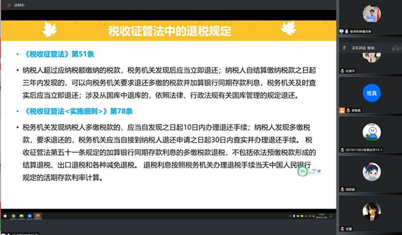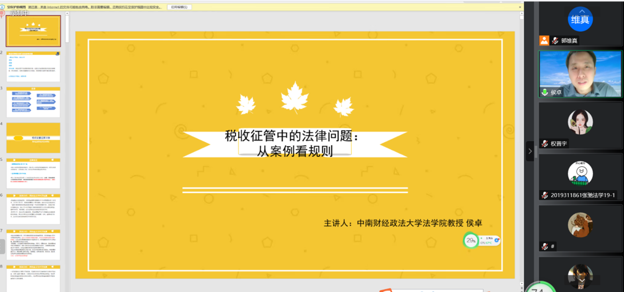 2022年11月29日下午,中央财经大学财税法工作坊第41期通过直播平台以线上讲座的形式举行。本次讲座的主讲人为中南财经政法大学法学院的侯卓教授,主题为“税收征管法重点条文的实践争议及其规则改进”。本次工作坊由指导老师郭维真副教授主持,法学院部分本科生、硕士研究生参加了本次工作坊。