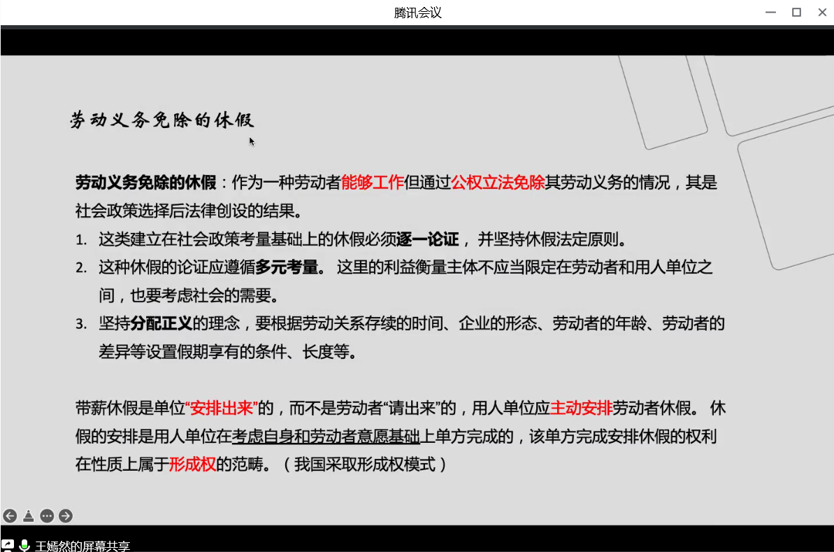 王嫣然同学对《德国劳动法》第14章“法定的劳动免除”进行了报告。在对该章内容整体梳理基础上,她从劳动义务免除的休假等角度出发阐释了其观点。沈建峰老师在同学汇报基础上进行了补充扩展。沈建峰老师提出劳动者各种假期的法律性质是不同的,事假、病假等属于劳动合同的履行障碍,而带薪休假则属于劳动合同义务的免除。