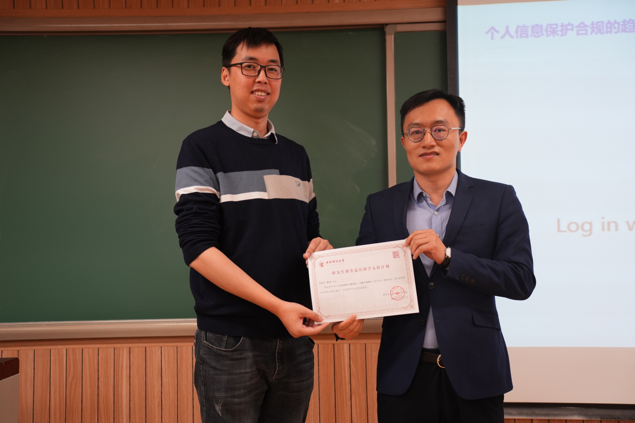 最后,刘权老师对本次讲座内容做总结发言。刘权老师表示,顾伟博士结合自己长期以来的实务经验和大量APP隐私保护实例,针对个人信息保护合规的现状、问题与趋势,通过其深入浅出和逸趣横生的讲解,为大家呈现了一场精彩的报告。对于顾伟博士谈到的个人信息保护合规实务相关问题,相信与会同学都有了更为深刻认识,也鼓励大家积极求索,对上述问题作进一步的思考与研究。刘权老师再次感谢了顾伟博士的精彩报告和对相关问题的详细解答,并为顾伟博士颁发了“研究生课堂嘉宾讲学支持计划”纪念证书。