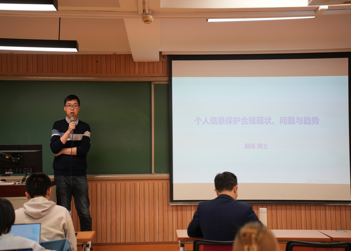 讲座正式开始前,刘权老师首先向大家介绍了顾伟博士。顾伟博士主要从事个人信息与网络安全法律研究工作,曾参与《信息安全技术个人信息安全规范》《信息安全技术网上购物数据安全指南》等个人信息、数据安全领域重要国家标准、行业标准的起草。