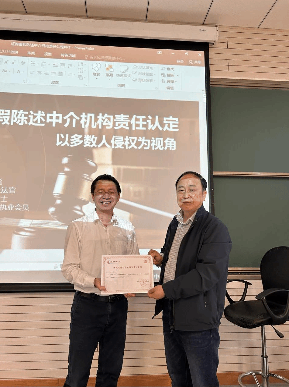 2023年4月25日,法学院研究生课程《企业与公司法》邀请北京金融法院林文彪法官为同学们授课,主题为“证券虚假陈述中介机构责任认定---以多数人侵权为视角”。本次讲座获中央财经大学研究生院课堂嘉宾讲学支持计划资助,法学院胡晓珂副教授主持并向林文彪法官颁发纪念证书,法学院2022级学硕与部分法律(法学)研究生参加。