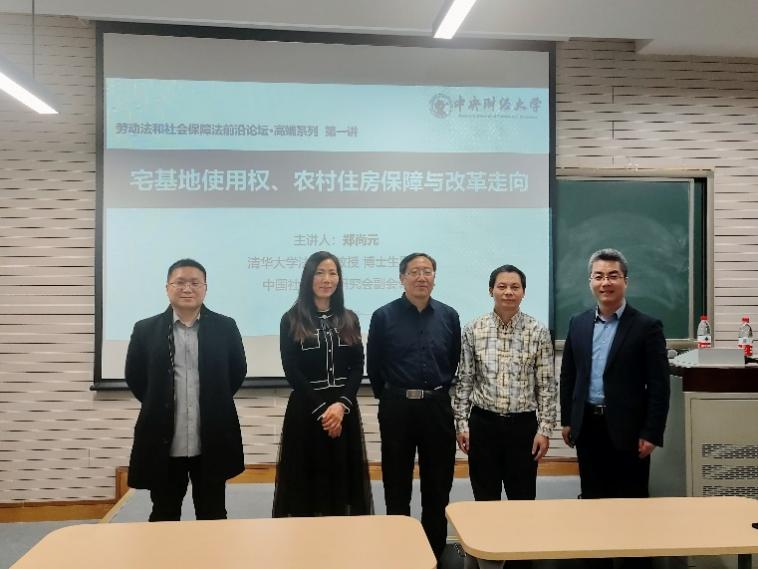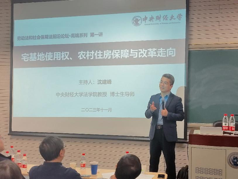 2023年11月11日晚,劳动法和社会保障法前沿论坛·高端系列第一讲在学院南路校区主教110教室举办。中国社会法学会副会长、清华大学法学院郑尚元教授为我院师生作“宅基地使用权、农村住房保障与改革走向”的主题讲座。讲座由中央财经大学劳动法和社会保障法研究中心主任沈建峰教授主持,中央财经大学不动产与自然资源法研究中心主任宋志红教授、中国政法大学民商经济法学院社会法研究所副所长王显勇教授、中央财经大学劳动法和社会保障法研究中心副主任李海明副教授等三位老师担任本次论坛的与谈人。法学院部分教师、博士生、研究生以及本科生共70余人参与了本次论坛。