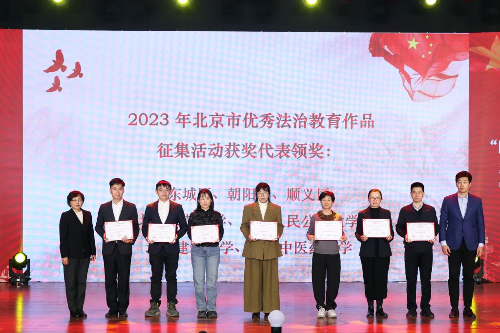 诵读完毕后进入颁奖环节。北京市教育委员会政策研究与法制工作处处长王艳霞和校宣传部部长、新闻中心主任雷洪峰为2023年北京市学生“学宪法·讲宪法”活动一等奖获奖代表颁奖,北京教育融媒体中心党委副书记、主任张淑芳和中央财经大学副校长栗峥为2023年北京市师生法治教育作品征集活动一等奖获奖代表颁奖。