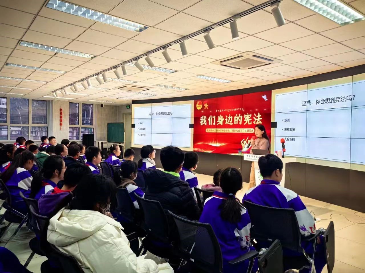 刘馨宇讲师以《我们身边的宪法》为主题,为全校学生上了一堂生动的宪法课。讲座以“提到宪法你会想起什么”这一话题开启,刘馨宇讲师通过与学生互动提高同学们学习宪法的兴趣。接下来,她分别从“宪法是什么”“宪法怎么用”和“为什么必须要有宪法”三个版块向学生缓缓揭开宪法庄严而神圣的面纱。讲座最后,刘馨宇讲师通过讲解“双减”“三孩政策”“人脸识别”等贴近中学生的宪法事例,加深学生对宪法的理解。讲座在师生热烈的掌声中结束,获得两校师生的一致好评。