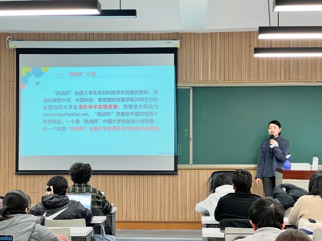 讲座伊始,简爱老师结合比赛内容、比赛周期及选拔方式,为同学们介绍“挑战杯”及“大创”的相关信息。她指出,尽管“挑战杯”及“大创”的选拔方式及赛道几经变化,但两个比赛追求创新、为国选材的竞赛精神及宗旨没有变。简爱老师希望本次讲座可以吸引并鼓励同学们积极报名参与相关比赛,在合作与竞争中提高个人综合能力与学术素养。